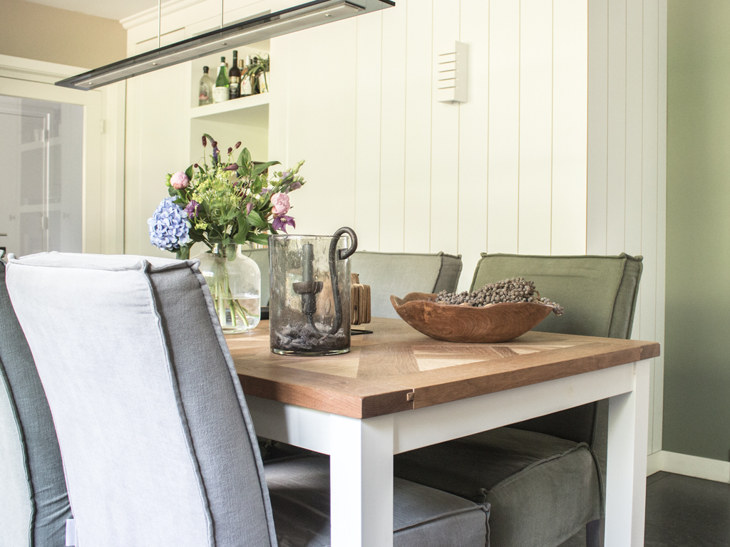 In de doorgang naar de woonkamer waren schuifdeuren geplaatst, maar er ontbraken kozijnen rondom. De timmerman zijn deze schuifdeuren nu echte blikvangers geworden, compleet met prachtige kozijnen. Als finishing touch adviseerde ik om de stoelen met stof te bekleden en vouwgordijnen op te hangen. Dit niet alleen voor de esthetiek, maar ook om de akoestiek in de keuken te verbeteren.